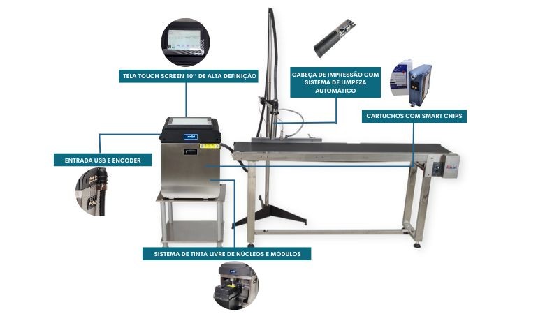 A principal característica desse equipamento é o uso de tecnologia de jato de tinta (inkjet) para aplicar tinta diretamente na superfície do material. Esse processo é realizado de forma rápida e precisa, permitindo a marcação em alta velocidade durante a produção.